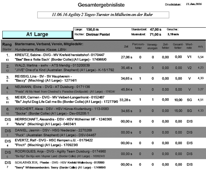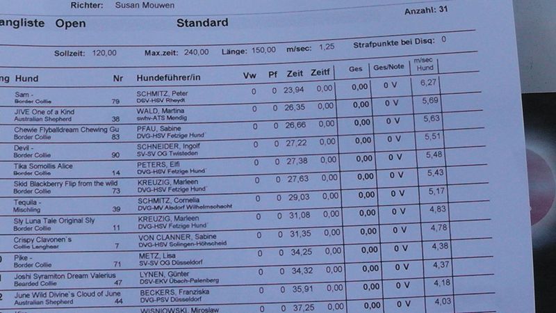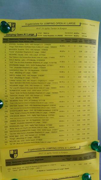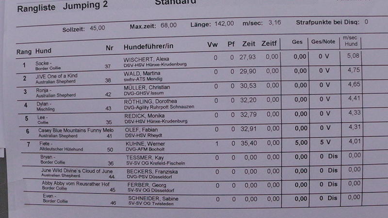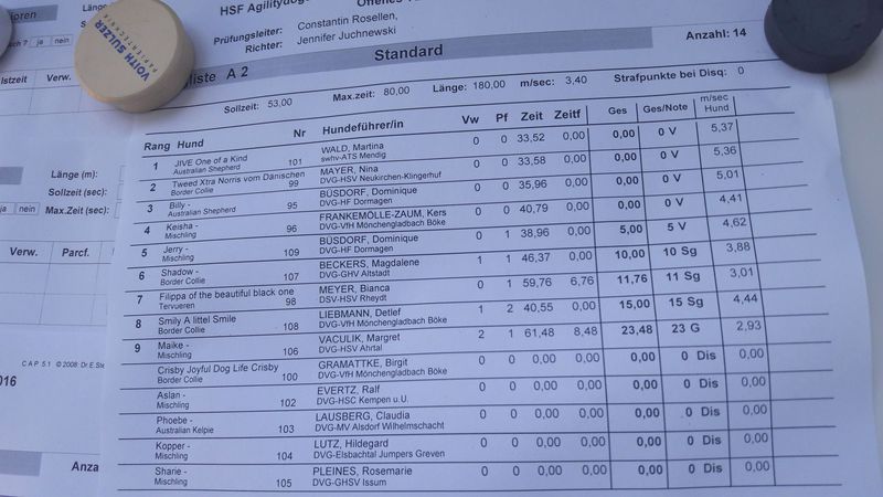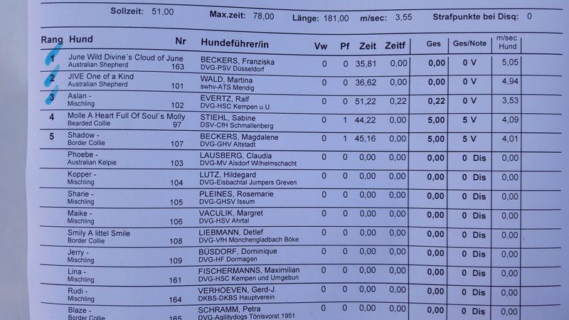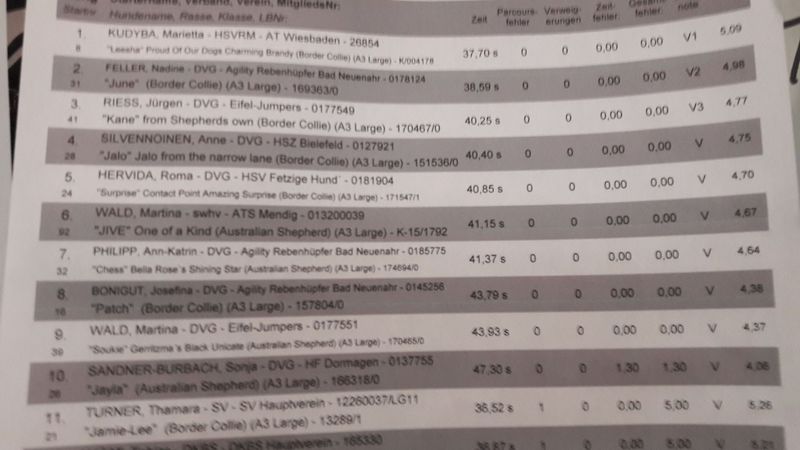 Der A-Lauf mit Jive war prima, sicher und schnell - V0 und Platz 1 von 17 Startern. Im JP war sie noch schneller (und ungeduldiger *schmunzel*) und ich war leider an einer Passage weder schnell noch präzise genug mit meinen Führhilfen und es folgte ein zielstrebiges DIS. Im Spiel für alle Large-Hunde war sie dann kaum noch am Start zu halten und wir hatten lt. Sprecher einen fehlerfreien Lauf in einer 27er-Zeit - das wäre eine Platzierung unter den Top 3 von 38 Startern gewesen. WÄRE..., denn viele Hundeführer hatten sich für den Start nicht abgemeldet, was zu einem kurzfristigen Durcheinander bez. Startfolge und Zuordung der Ergebnisse führte. In der Ergebnisliste rangierte dann Jive auch unter "ferner liefer" mit einer Verweigerung. Kann passieren...:).