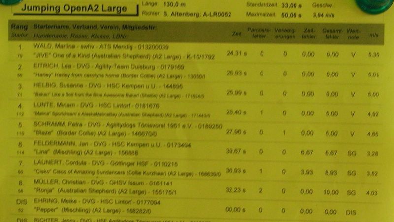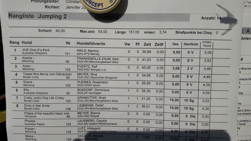 Beide Hunde waren "gut drauf"...:) - Jive manchmal etwas unkonzentriert, da sie überraschend läufig geworden war - aber wie immer mit viel Engagement...:)! Jeweils eine Verweigerung in den A-Läufen mit anschließendem DIS, da ich diese Fehler immer in der Gesamtsequenz aus Übungszwecken wiederhole. Die Jumpings waren fehlerfrei: jeweils Platz 3 und Platz 5 (von 44).
