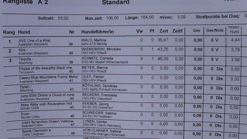 Der Sonntag begann mit dem Spiel A1/A2 - und Jive hörte zu und rannte... mit 5,41 m/s auf Platz 9 von 31 Startern. Der A-Lauf war SCHWER... und dennoch lief Jive auch hier wie am Schnürchen, die RC an allen Zonengeräten waren einfach klasse und kurz vor Schluss scheiterten wir da, wo alle Starter scheiterten. Dennoch konnte ich mir ein breites Grinsen und viel "suuuupi, feiiiiine Jiviiieee" nicht verkneifen - es war ein DIS, das sich trotzdem einfach mega gut angefühlt hat...:) - getreu meinem Motto: lieber ein toller Lauf und ein DIS, als eine Quali, die es nicht wert ist!